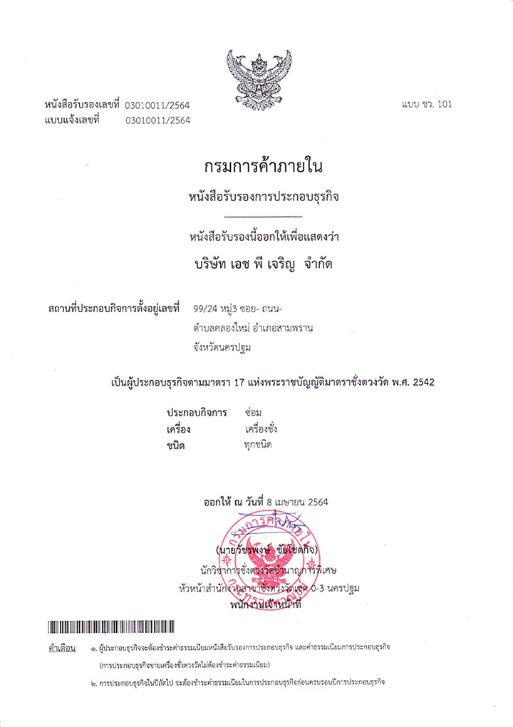 รวมไปถึง การตรวจรับรองเครื่องชั่งโดย ชั่ง ตวง วัด จากกระทรวงพาณิชย์